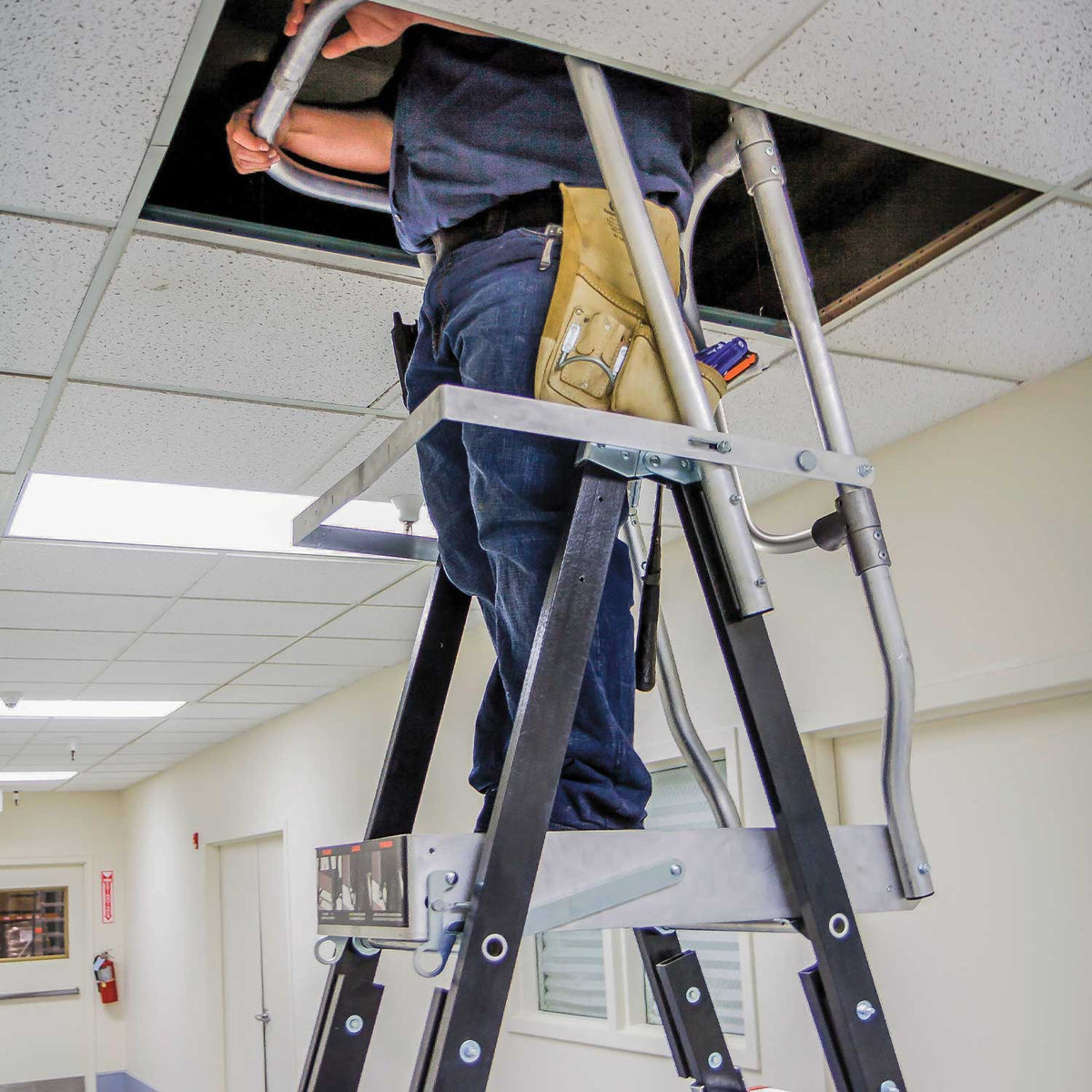 The Adjustable Safety Cage can easily be equipped with Wheel Lift™ casters to easily move the cage while fully deployed. The Little Giant Saddle Bag™ frees up your hands while you work. Compatible with optional Ratchet™ Levelers, you can adjust your ladder to meet your job site’s needs.