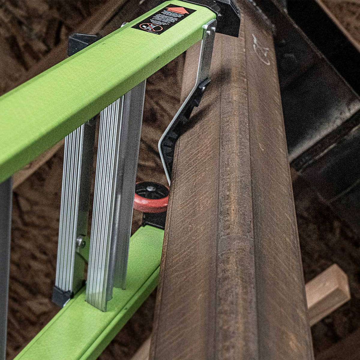 The extension side of the ladder is narrow enough to access tight spaces between wall studs, ceiling trusses and roof or attic access ports, and can be safely set up on poles or outside corners. The wall pad feet are designed for use on inside corners and flat walls without damage to the surface.
