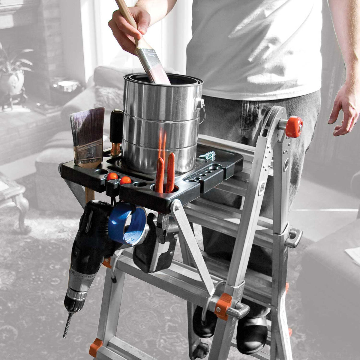 The Project Tray™ is a multi-use accessory designed for your multi-position ladder from Little Giant Ladder Systems®. The Project Tray™ rests securely on your ladder’s rungs and acts as the perfect tool tray while you work. The grooves and slots hold almost any tool you will need, including hammers, drills, screwdrivers and power cords. It even has a place to hold your paint can. The magnetic tray holds screws and nails, so you won’t have to worry about losing them. The Project Tray is rated to hold up to 25 lbs. and is compatible with your Little Giant® multi-position ladder.