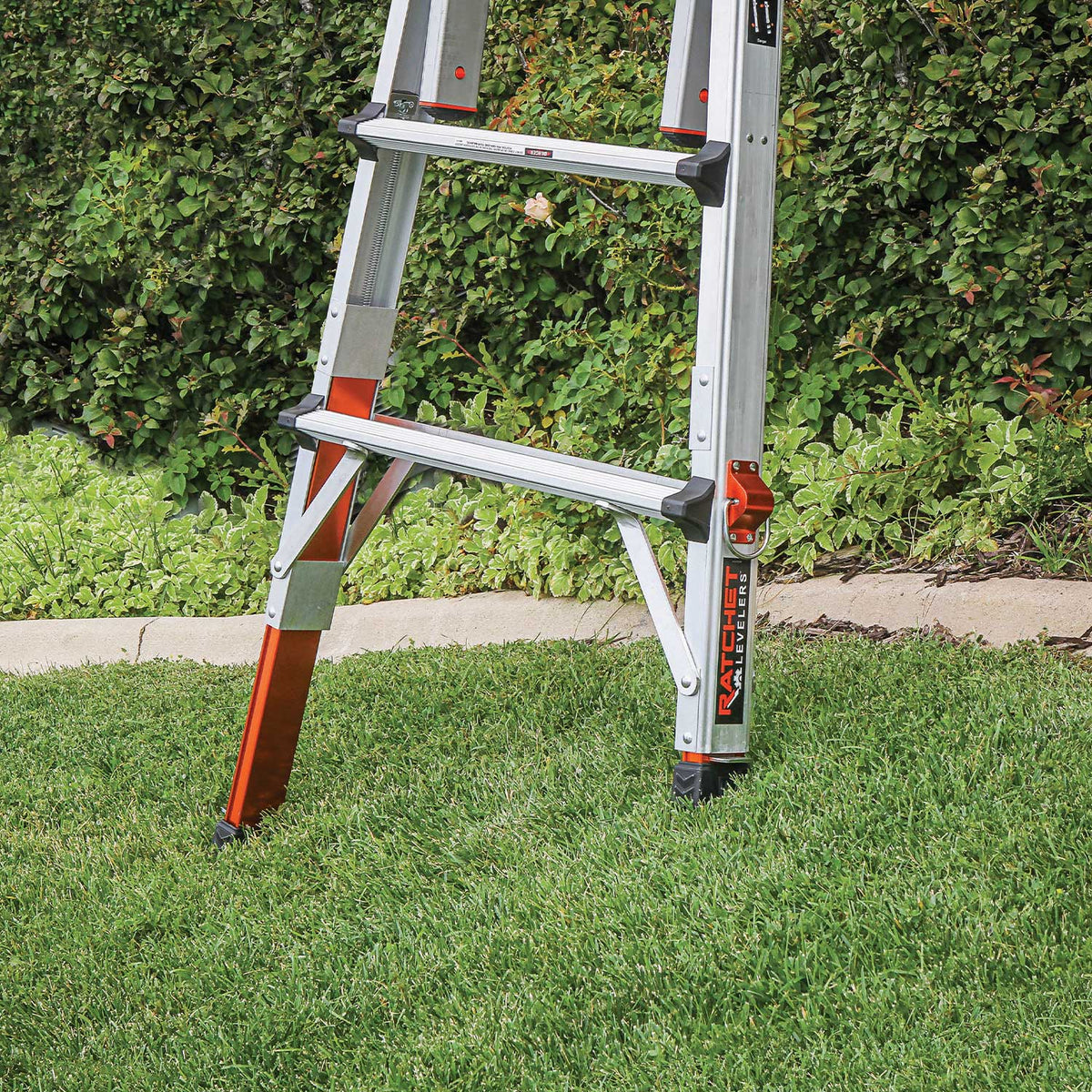 With the optional attached Ratchet™ levelers, you can adjust the ladder’s legs in a hands-free motion in seconds. The retractable legs yield more than 7 inches of leveling adjustment, so you can have a stable ladder, regardless of the terrain.