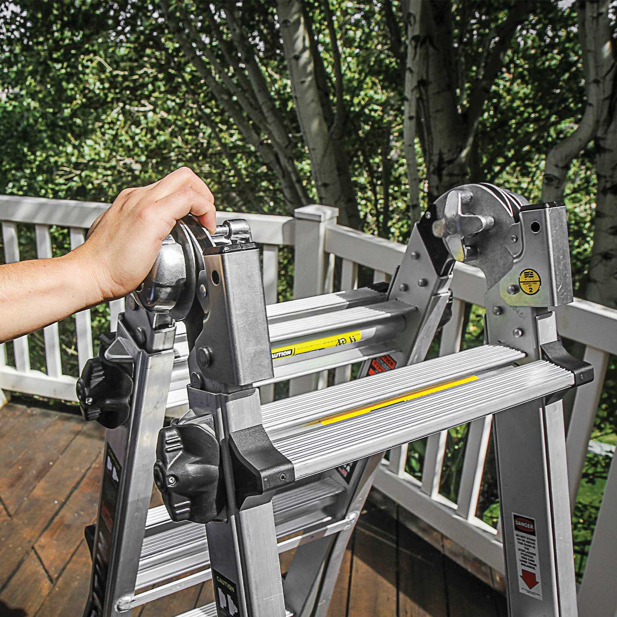 This ladder is a multi-position ladder, meaning, you can set it up in different configurations that suit the project at hand. Use the Quantum as a stepladder or extension. Set it up on staircases or in 90-degree or trestle-and plank* scaffolding configurations. With the sleek metal palm buttons, you will be able to effortlessly adjust your ladder.